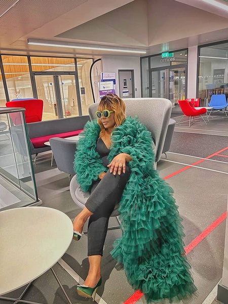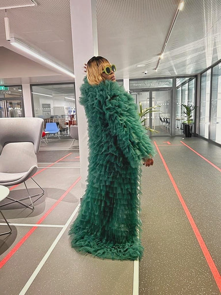 The Emerald Tiered Tulle Statement Coat is designed to transform even the simplest outfit into a head-turning moment. Crafted from cascading layers of soft tulle, this full-length piece delivers volume, texture, and undeniable presence.