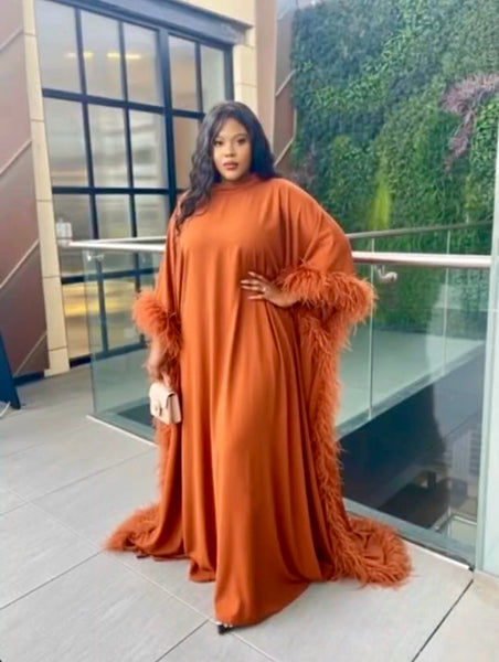 Step into any event with quiet luxury and undeniable elegance in our stunning "Luxe Ostrich Feather Trim Kaftan Dress | Elegant Statement Abaya"