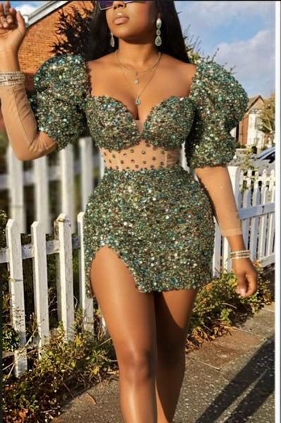 Make a show-stopping entrance in this stunning emerald green sequin mini dress. Designed to hug your curves, this bodycon dress features a flattering sweetheart neckline and playful, short puff sleeves. The look is elevated with sheer mesh long sleeves and a delicate sheer midriff panel, adding a touch of allure. A chic side slit completes this head-turning look, perfect for any special occasion.