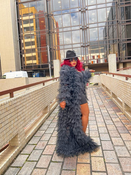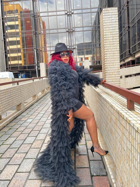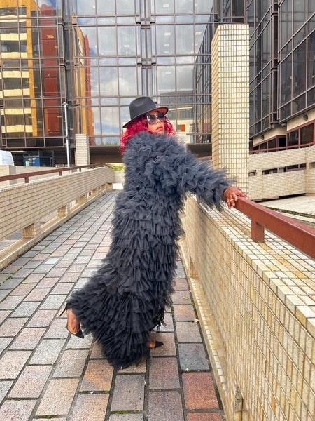 Turn every entrance into a moment with this dramatic black ruffled tulle statement coat. Designed for bold, fashion-forward women, this couture-inspired piece features cascading layers of soft, airy ruffles that create striking movement and undeniable presence.
