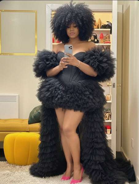 Command attention in "The Ophelia," a show-stopping black dress designed to turn heads. This exquisite garment combines a structured, figure-flattering corset bodice with dramatic off-shoulder ruffled sleeves and a playful high-low tulle skirt. The voluminous ruffles cascade down the back, creating a stunning train effect that ensures a memorable entrance at any event. Crafted for impact, this dress is perfect for galas, cocktail parties, or any occasion where you want to make a bold fashion statement. Pair it with vibrant heels, as shown, to add a pop of color to the monochromatic elegance.